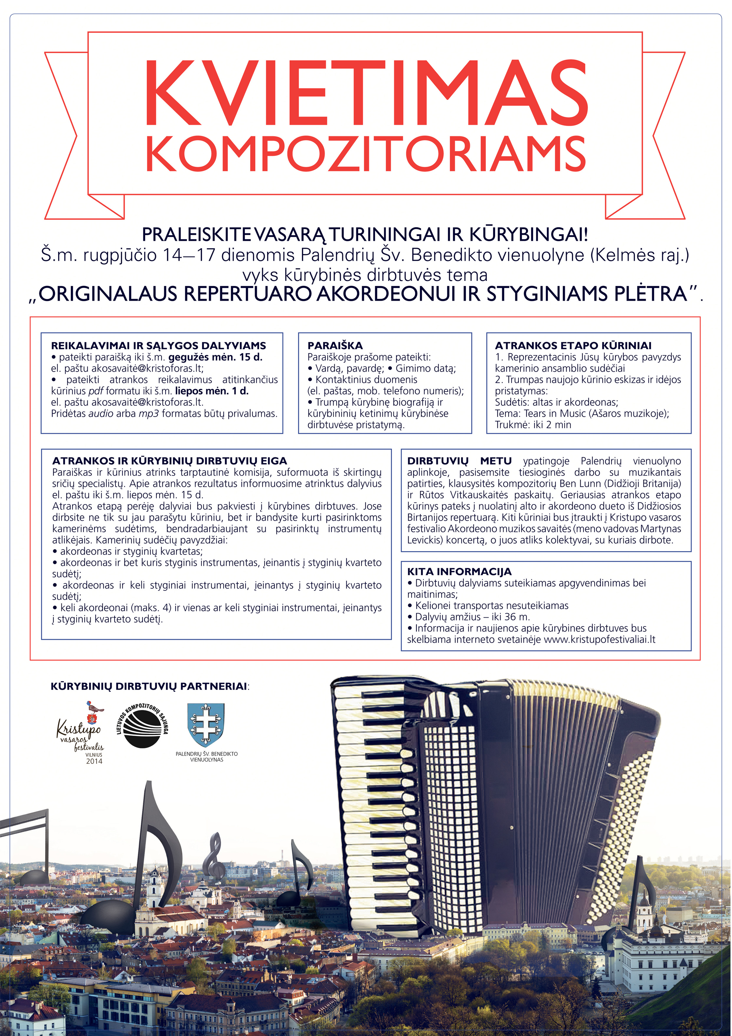 Iki š. m. liepos mėn. 1 d. el. paštu akosavaite@kristoforas.lt reikės pateikti atrankos reikalavimus atitinkančius kūrinius pdf formatu (pridėtas pavyzdys audio arba mp3 formate būtų privalumas). Atrankos etapo kūriniai: 1) reprezentacinis jūsų kūrybos pavyzdys kamerinio ansamblio sudėčiai; 2) trumpas naujo kūrinio eskizas ir idėjos pristatymas. Sudėtis: altas ir akordeonas; tema „Tears in Music" („Ašaros muzikoje"); trukmė iki 2 min.