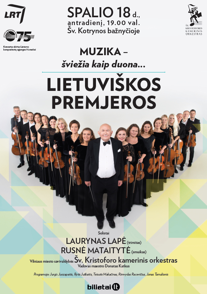 2016 m. spalio 18 d. 19 val. Vilniaus šv. Kotrynos bažnyčioje Šv. Kristoforo kamerinis orkestras, vadovaujamas Donato Katkaus, pakvies į lietuviškos muzikos vakarą, skirtą Lietuvos kompozitorių sąjungos 75-mečiui. „Dar negirdėta lietuvių kompozitorių muzika naujovių išsiilgusioms ausims - tai lyg šviežia ir kvapni dar neišmėginto recepto duona išalkusioms sieloms" - žada koncerto organizatoriai.